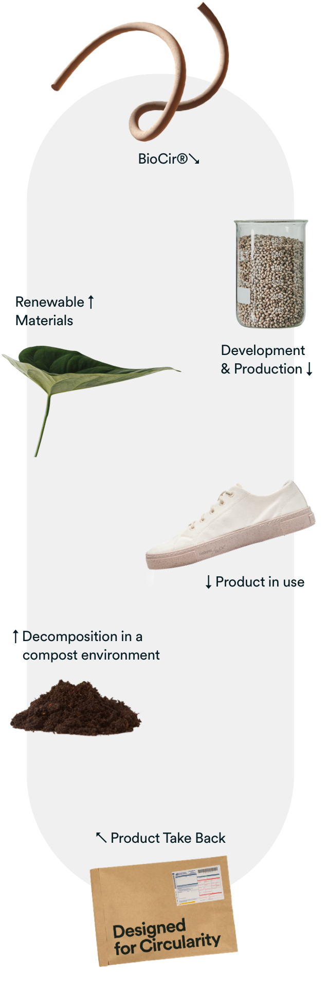Enabled through our BioCir® material, products reach their end- of-life responsibly through a biological recycling mechanism, including full decomposition and biodegradation of the material back to the soil safely in an industrial compost facility, leaving no negative impact on compost quality, completing a fully circular process required.