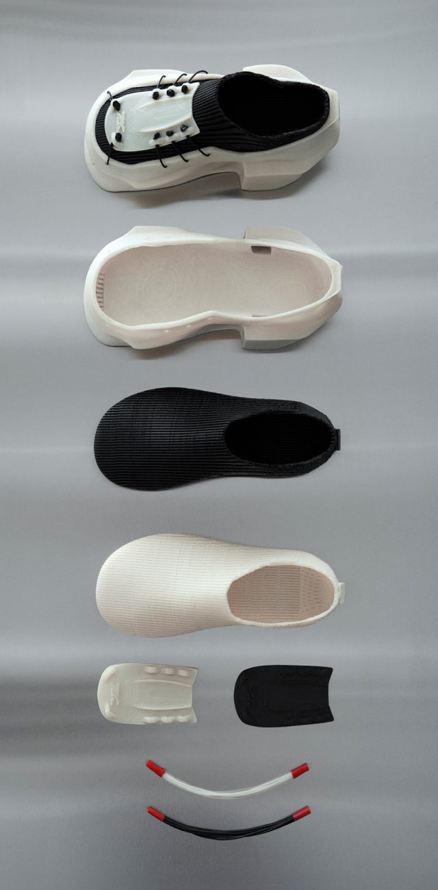 Zulu Kuki’s 3D-printed shoe boldly departs from traditional aesthetics. Moving away from the conventional clog, Kuki emphasizes modularity and customization, allowing the shoe to adapt to different needs and styles. Inspired by 70s automotive culture, especially the sleek lines of racing cars like
