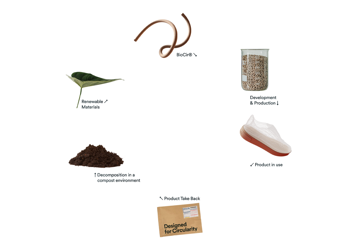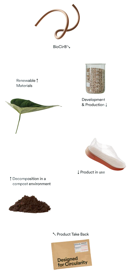 BioCir®flex soles are designed to reach their end-of-life responsibly through the post-industrial and post-consumer recycling paths, as well as through biological recycling mechanism - biodegradation - in an industrial compost facility leaving no negative impact on compost quality and the environment.